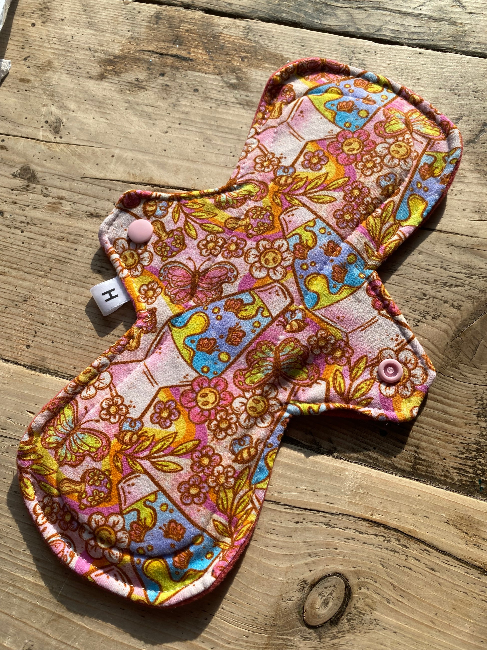 These pads are made with a breathable and absorbent cotton lycra to go against the skin, zorb for the core and a soft shell fleece base. This base has a waterproof layer to prevent leaking and a fleece outer layer to prevent the pads from moving too much in your underwear.