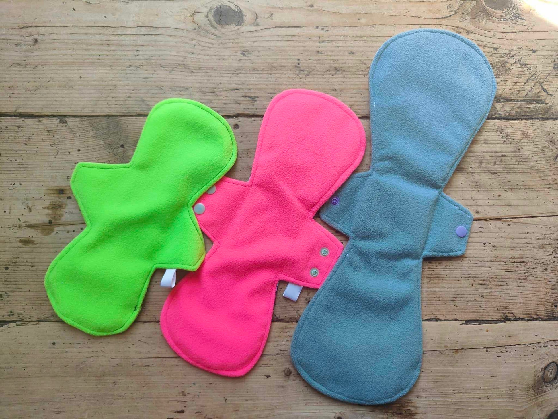 These pads are made with a breathable and absorbent cotton lycra to go against the skin, zorb for the core and a soft shell fleece base. This base has a waterproof layer to prevent leaking and a fleece outer layer to prevent the pads from moving too much in your underwear.