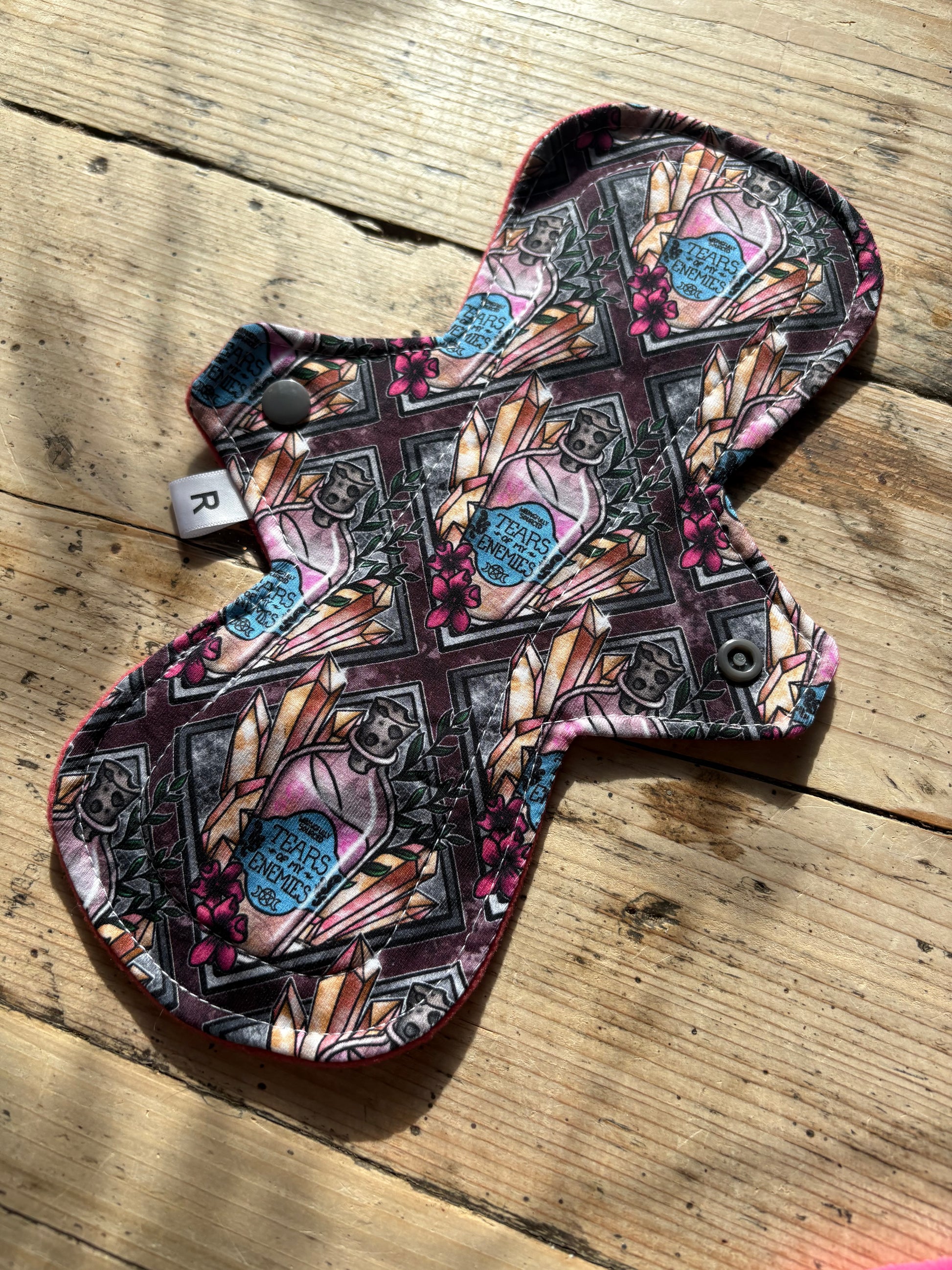 These pads are made with a breathable and absorbent cotton lycra to go against the skin, zorb for the core and a soft shell fleece base. This base has a waterproof layer to prevent leaking and a fleece outer layer to prevent the pads from moving too much in your underwear.